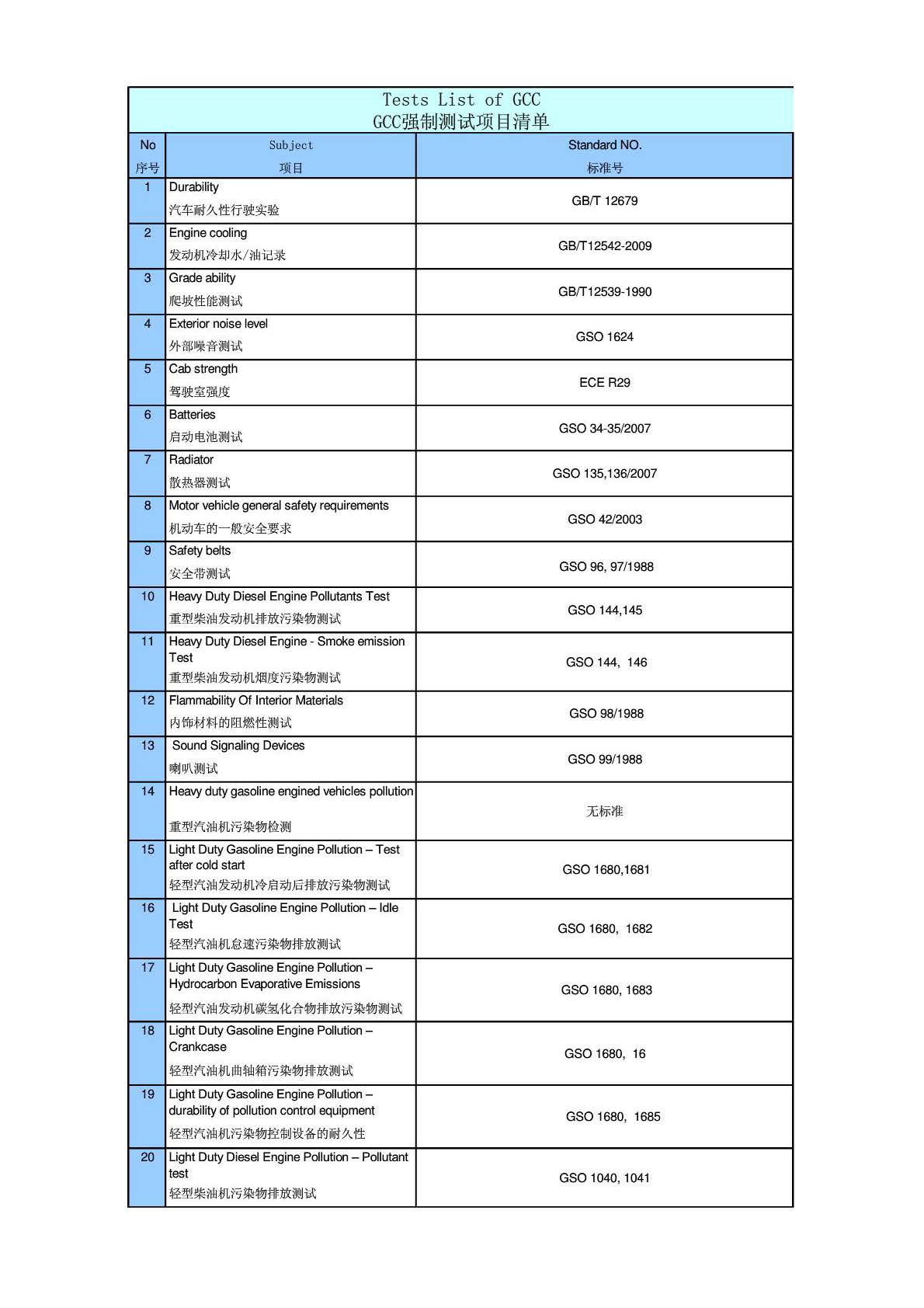 ?????????????????????????????????????????????????????????????? 下圖為海灣國家GCC車輛認(rèn)證相關(guān)的測試項目的總結(jié):