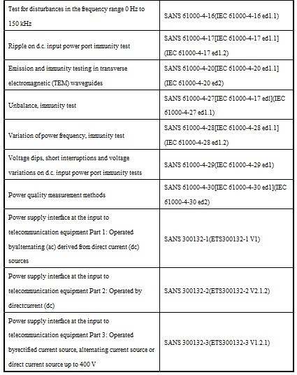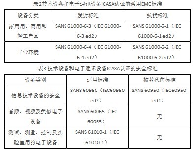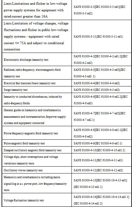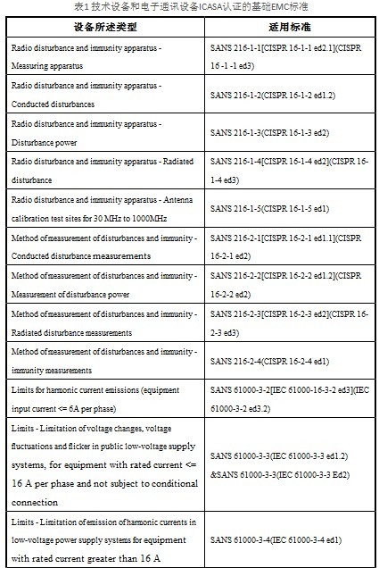 2010年1月22日,南非獨立通信管理局(ICASA)發(fā)布了《電子通訊設備技術標準法規(guī)》。ICASA又于2013年4月16日發(fā)布了有關實施該法規(guī)的公告。法規(guī)及公告中都規(guī)定了技術設備和電子通訊設備的ICASA法規(guī)符合性標準清單,這些標準主要涉及設備的電磁兼容(EMC)標準、安全標準和性能標準。其中,EMC標準還包括基礎EMC標準,通用EMC標準和產(chǎn)品/產(chǎn)品族的EMC標準。下面3張表格列出了電子通訊設備進行ICASA認證的基礎EMC標準、通用EMC標準以及安全標準。